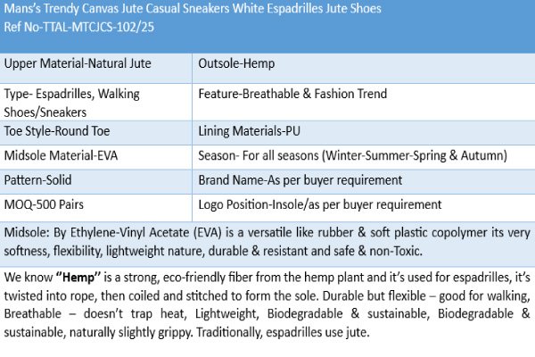 We know ‘’Hemp’’ is a strong, eco-friendly fiber from the hemp plant and it’s used for espadrilles, it’s twisted into rope, then coiled and stitched to form the sole. Durable but flexible – good for walking, Breathable – doesn’t trap heat, Lightweight, Biodegradable & sustainable, Biodegradable & sustainable, naturally slightly grippy. Traditionally, espadrilles use jute.